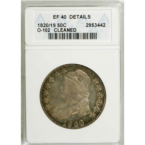 <B>1820/19 50C Square Base 2--Cleaned--ANACS. XF40 Details.</B></I> O-102. NGC Census: (2/113). PCGS Population (8/64). Numismedia Wsl. Price: $265. (#6125)<BR><BR><b>Shipping:</b> Coins & Currency (<a target="_blank" href="http://www.heritageauctions.com/common/shipping.php">view shipping information</a>)