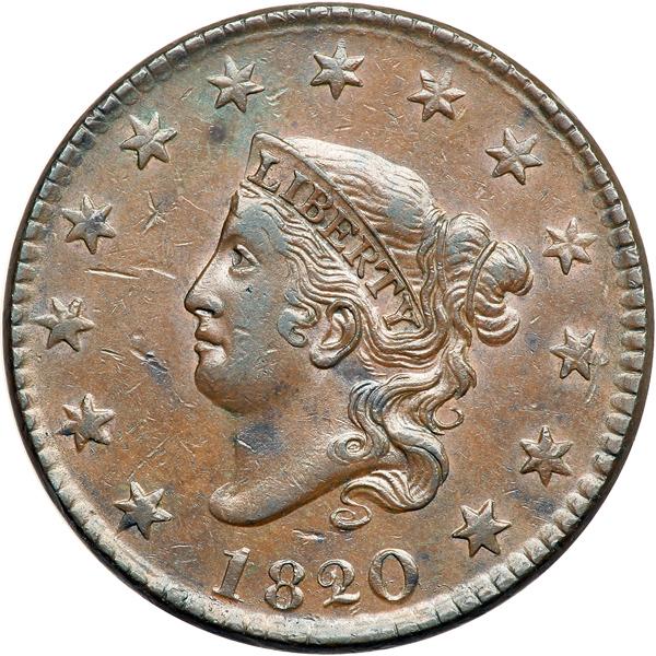 1820/19 N-1 R1 VF35+. Large Overdate 20 over 19. VF-35+. Sharpness EF40 with a few too many light contact marks in the field before the portrait for the higher grade. A thin horizontal nick under the right side of star 4 and a small spot of darker olive toning below star 6 are the best identifying marks. Glossy light to medium brown with small splashes of darker steel toning on both sides and frosty mint luster showing in protected areas. LDS. Die lapping has removed all traces of the 9 under the 0 in the date, but the 1 under the 2 is still clear. The repunching on the 18 is gone and the reverse is rotated 25 degrees CCW. Removed from an NGC slab graded AU55BN (NGC label included, and it shows the attribution and Reiver provenance). DWH #2906.