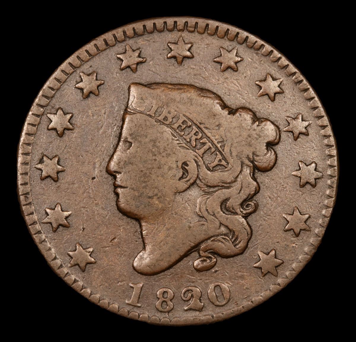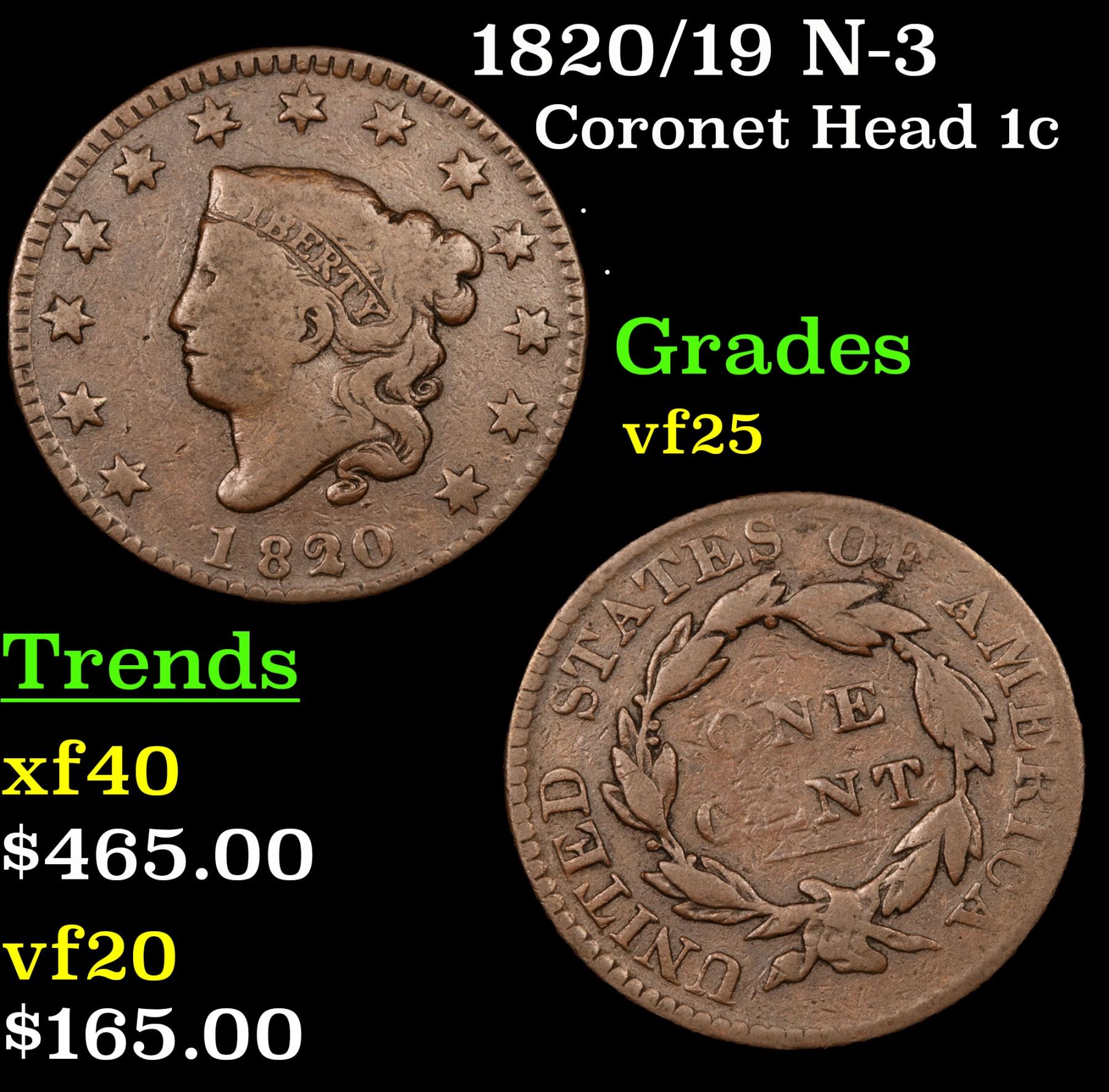 1820/19 N-3 Coronet Head Large Cent 1c Grades vf+.