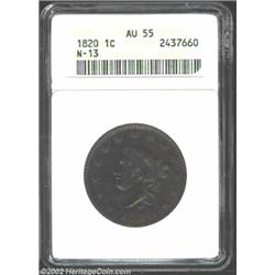 1820 1C Large Date AU55 ANACS. N-13, R.1. Well defined in the centers with attractive glossy olive-b