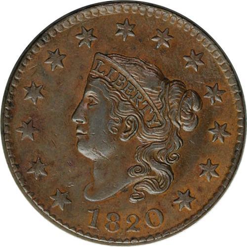 <B>1820<1C> Large Date. N-11, High R.2. AU55 NGC. XF40 EAC.</B></I> A long peak shows on the 1 in the date and the first S in STATES is noticeably low. This is an earlier die state that does not show the die lapping that occurred on later specimens. Medium brown color with lighter golden accents at selected peripheral areas.<BR><I>Ex: Amey (7/10/1971).</B></I> Envelope Included.