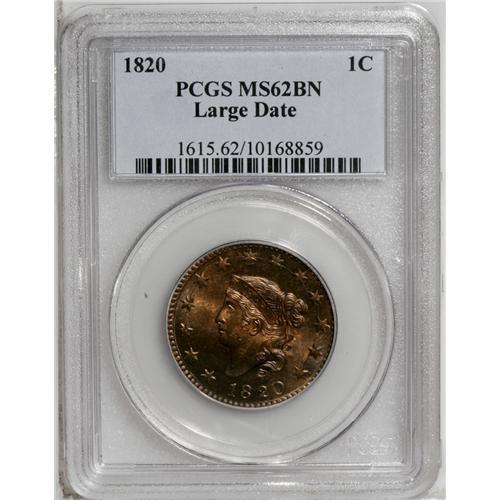 1820 1C Large Date MS62 Brown PCGS. N-13, R.1. A fully