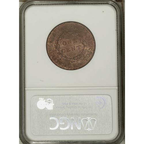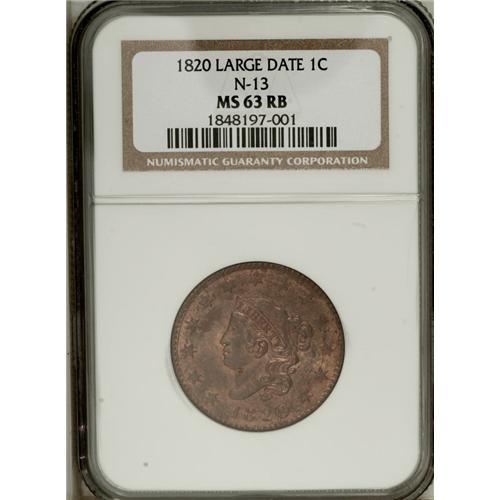 <B>1820<1C> Large Date MS63 Red and Brown NGC.</B></I> N-13, R.1. This is a Randall Hoard variety, instantly identified by the circular die cracks through every star and the date. Perhaps 90% of all Mint State 1820 large cents in existence today are from this die pair. Other subtle characteristics are noted for this variety, including a tripled L in LIBERTY. This is an attractive Mint State example with brilliant orange surfaces and light brown toning. A few blemishes and spots are evident, but the overall quality is quite fine. EAC 60+.