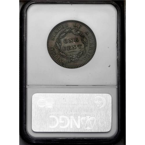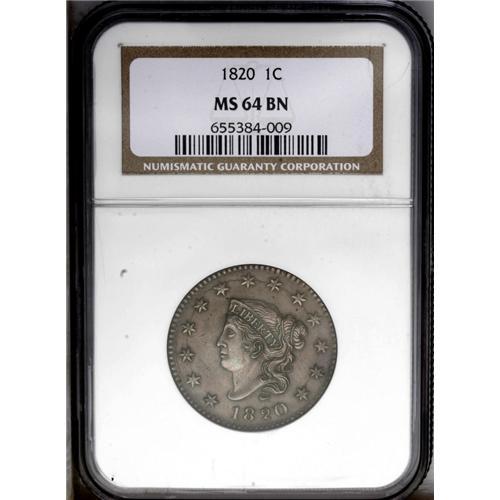 <B>1820<1C> Large Date MS64 Brown NGC.</B></I> N-13, R.1. A lovely deep golden-brown near-Gem, smooth aside from a couple of faint marks on the left obverse field. A strike-through on the top of the U in UNITED identifies the present piece. EAC 60. <BR><BR><B>Important notice:</B> Heritage usually auctions material at the rate of 200-250 lots per hour. On some occasions eBay Live bid software or the Internet may not be able to keep up with the pace of the auction. We recommend placing a realistic absentee bid now as insurance to avoid disappointment. Occasionally the auctioneer may eliminate or reject an eBay Live bid, and the auctioneer may also reopen a lot after the close of the eBay live bidding (usually because we missed an audience bid), and may reject your bid even if it shows you as the winning bidder. By bidding via eBay Live, you agree that Heritage may award the lot to another bidder at its sole discretion under the circumstances described above or any other reasonable circumstances. Since eBay bids are not shown to us until we open the lot on the floor, we treat those bids just like floor bids. In most cases the floor responds before the eBay bid is presented to us, due to Internet lag time, so for consistency we have made it a policy that floor bids are always considered first over tie eBay live bids. Also please note that all Heritage lots purchased through eBay Live carry a 20% Buyer's Premium. Please make sure you read the Terms and Conditions before you bid. This lot is being auctioned in conjunction with a live floor auction by Heritage Galleries & Auctioneers. All final auction and invoice information will be supplied by Heritage Galleries & Auctioneers, and all other information should be considered preliminary. Lot:267 <BR><BR><B>Winning Notification and Billing:</B> After the FINAL session in this auction is complete, Heritage will send e-mail and snail mail invoices. This process normally takes several days. All final auction and invoice information will be supplied by Heritage Galleries & Auctioneers, and all other information should be considered preliminary. <BR><BR>This auction will be conducted on a live auction floor and over the Internet through eBay Live. If you choose to place an absentee bid, please take a moment to <font color='#0000ff'><u><a href='http://pages.ebay.com/liveauctions/help/before/laabsentee.html'>learn how eBay Live absentee bidding works</a></u></font><font color='#000000'>
