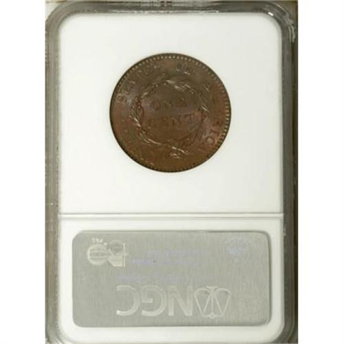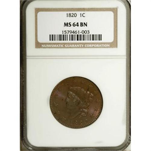 <B>1820 1C Large Date MS64 Brown NGC.</B></I> N-13, R.1. This handsome near-Gem may be designated as Brown, but considerable fire-red outlines design elements. The major devices are well struck, and the obverse has only minor carbon and contact. EAC 63.<BR><BR><B>Coin Engraver:</B> Robert Scot or John Reich<BR><BR><b>Shipping:</b> Coins & Currency (<a target="_blank" href="http://www.heritageauctions.com/common/shipping.php">view shipping information</a>)