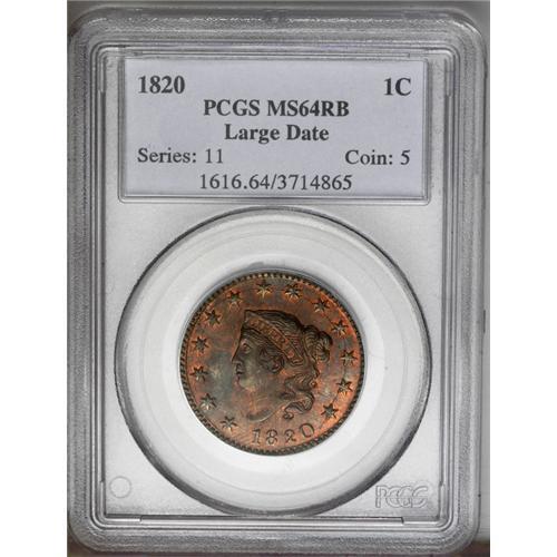 1820 1C Large Date MS64 Red and Brown PCGS. N-13, R.1.