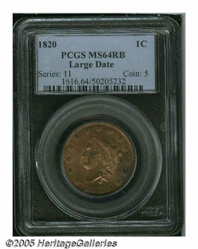 1820 1C Large Date MS64 Red and Brown PCGS. N-13,