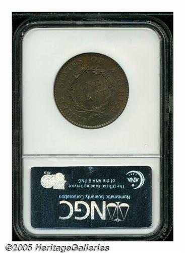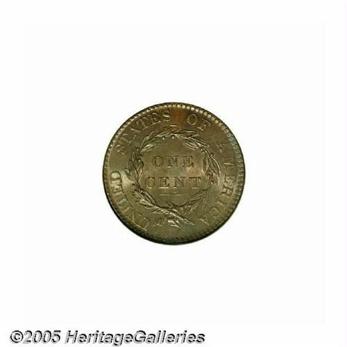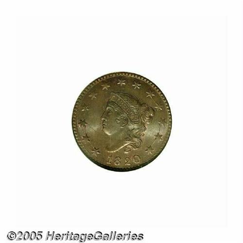 <B>1820<1C> Large Date MS67 Brown NGC.</B></I> N-13, R.1. An often encountered Randall Hoard variety with a multiply repunched L in LIBERTY and heavy die cracks (as made) that connect the stars. The famous hoard consisted of a buried keg of Mint State large cents dated 1816 to 1820 that was found in 1868 by a Georgia merchant. After passing through various intermediaries, most of the hoard ended up in the possession of John Swan Randall, a Norwich, N.Y. collector who was prominent in hobby circles in the 1870s. This attractive specimen features glossy light brown patina interspersed with considerable mint red. The design elements are sharply struck, save for the usual softness on the star centers. The remarkably clean and well preserved surfaces display just a couple of trivial, unobtrusive marks on Liberty's chin. While numerous Uncirculated examples of this issue are extant, few can compare with the outstanding quality of this Superb Gem. This is evident from the NGC population figures shown below, as well from auction records which indicate only one MS67 appearance within the last ten or so years. Population: 3 in 67, 0 finer (5/05).