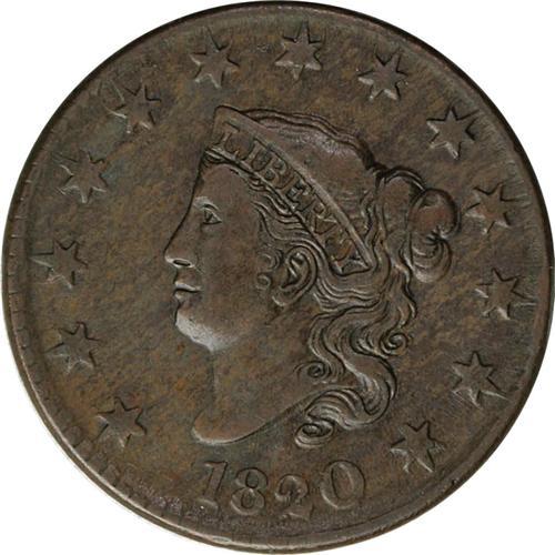 <B>1820<1C> Large Date. N-9, R.3. XF45 NGC. Fine 15 EAC.</B></I> The curled base 2 in the date is very low, and a die scratch extends the left foot of the Y in LIBERTY. Olive-brown surfaces, the peripheral details are somewhat softly defined. There are no mentionable marks on either side. A small amount of counterclockwise die rotation is seen.<BR><I>Ex: George Ramont (9/20/1969).</B></I> Envelope Included.