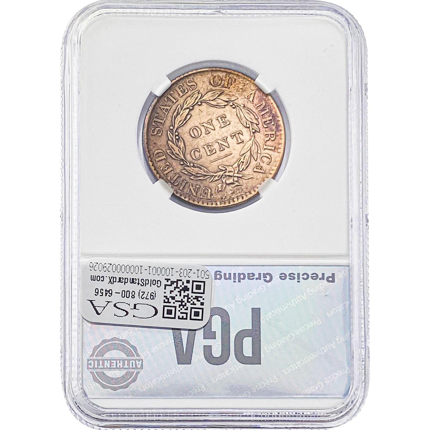 l. All non-certified coins and currency are guaranteed genuine, but are not guaranteed as to grade, since grading is a matter of opinion, an art and not a science, and therefore the description rendered by GSA or any third-party grading service may not agree with the opinion of others (including trained experts), and the same expert may not grade the same item with the same grade at two different times. GSA may, but is not obligated to, express an opinion as to non-certified numismatic items, in GSA’s opinion, or by its employees’ experience and the current interpretation of the American Numismatic Association’s standards as of the date the catalog was prepared. There is no guarantee or warranty expressed or implied that the grading opinions utilized by GSA, if any, will meet the standards of any grading service at any time in the future.