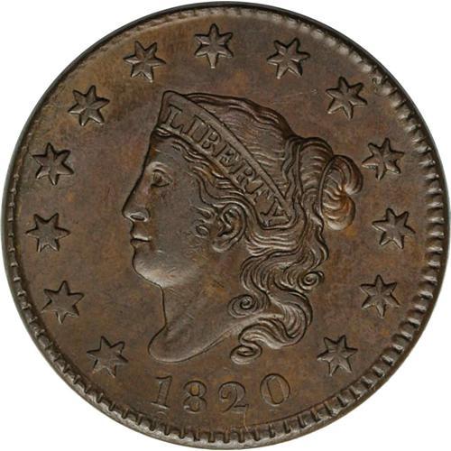 <B>1820<1C> Small Date. N-8, Low R.3. AU58 NGC. AU50 EAC.</B></I> Small wide date with the 8 leaning left. The R and T in LIBERTY nearly touch. Light wear shows on the highpoints. A small, lateral abrasion is noted just above the ribbon in the lower reverse field. A visually pleasing example.<BR><I>Ex: Howard R. Newcomb (3/5/1938); Willard C. Blaisdell; Del Bland (4/10/1973).</B></I> Envelope Included.