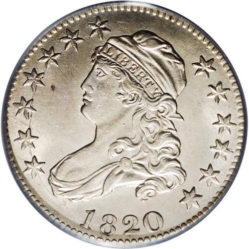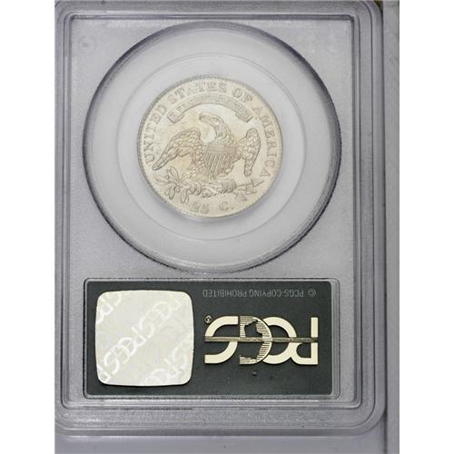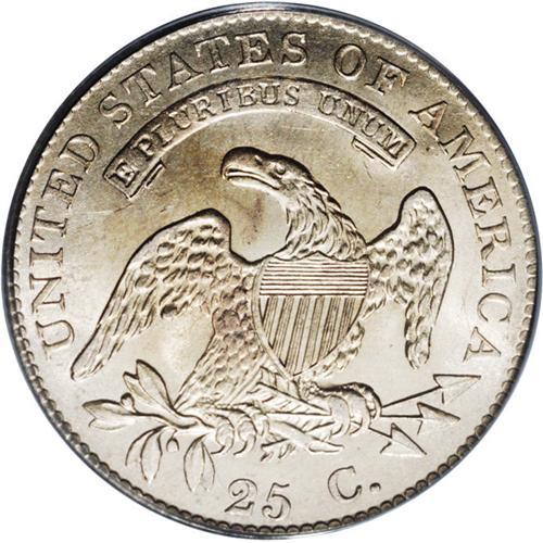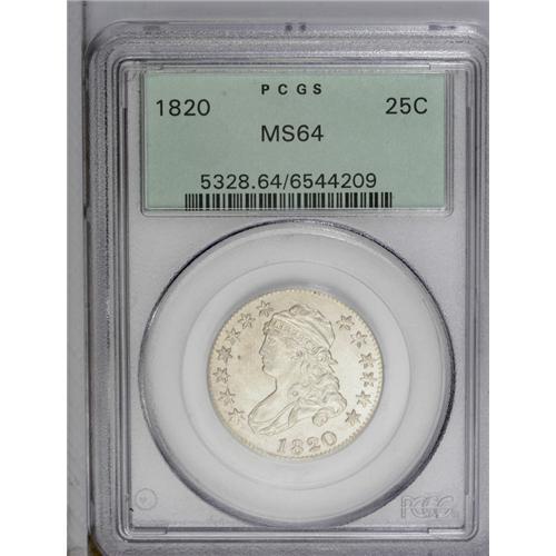 <B>1820<25C> Large 0 MS64 PCGS.</B></I> B-3 R.3. The 0 in the date is wide and similar in height to the 2, star 11 is repunched, and there is a prominent center dot on Liberty's neck. As with many B-3s, a die crack extends from the 18 of the date to star 7. Only star 13 and the eagle's claws show noticeable softness of strike. Satiny surfaces are essentially untoned and have escaped all but the tiniest abrasions or paper-thin marks. Only the extraordinary Eliasberg coin that just sold in our 2006 Palm Beach auction, an NGC MS67 B-3 that was misidentified as a Small 0 and realized over $63,000, is appreciably finer than the present example. In fact, we could no other offerings of this die pairing in any Mint State grade.