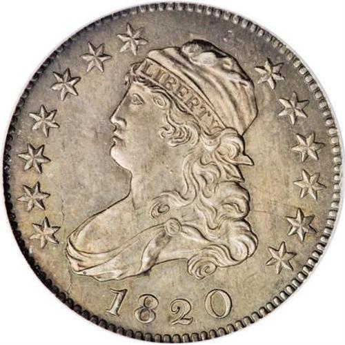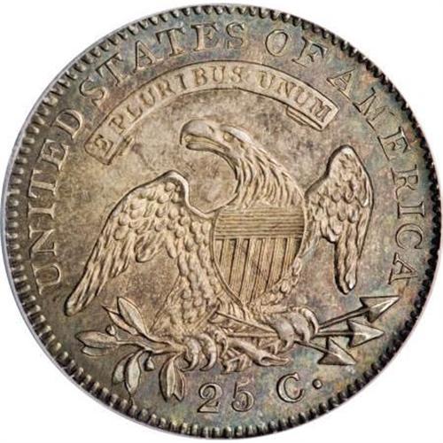 <B>1820 25C Large 0--Obverse Damage--NCS. Unc Details.</B></I> B-2, R.2. At first glance, this exquisitely struck and deeply toned Bust quarter appears to be a Gem. Close study locates a vertical pinscratch near the bust tip. The obverse is bathed in sea-green, while the reverse has a tobacco-brown center framed by emerald-green and cobalt-blue.<BR><BR><B>Coin Engraver:</B> John Reich<BR><BR><b>Shipping:</b> Coins & Currency (<a target="_blank" href="http://www.heritageauctions.com/common/shipping.php">view shipping information</a>)