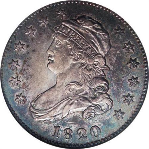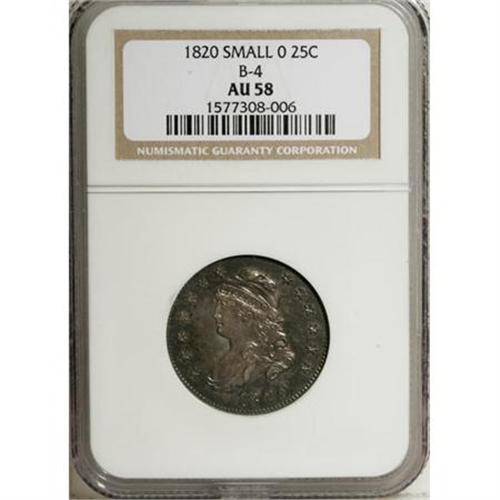 <B>1820 25C Small 0 AU58 NGC.</B></I> B-4, R.2. The date has a small 8, star 7 points to the lower part of the cap, and the I in PLURIBUS is centered under the left stand of the second T in STATES. Splashes of blue, olive-green, and purple intermingle over quite clean surfaces that retain a fair amount of luster. Sharp definition is apparent on all of the design features. A pleasing Capped Bust quarter.<BR><BR><B>Coin Engraver:</B> John Reich<BR><BR><b>Shipping:</b> Coins & Currency (<a target="_blank" href="http://www.heritageauctions.com/common/shipping.php">view shipping information</a>)