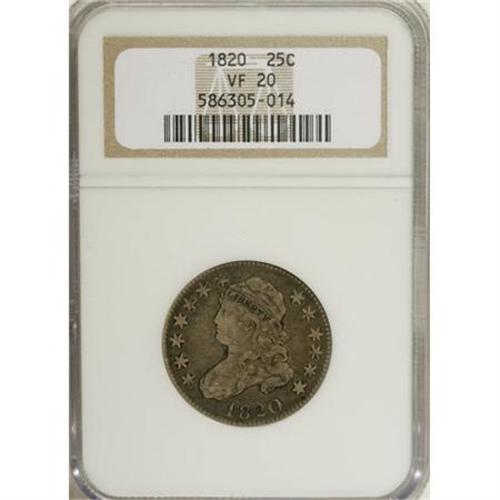 <B>1820 25C Small 0 VF20 NGC.</B></I> NGC Census: (5/84). PCGS Population (5/56). Mintage: 127,444. Numismedia Wsl. Price for NGC/PCGS coin in VF20: $275. (#5328)<BR><BR><b>Shipping:</b> Coins & Currency (<a target="_blank" href="http://www.heritageauctions.com/common/shipping.php">view shipping information</a>)