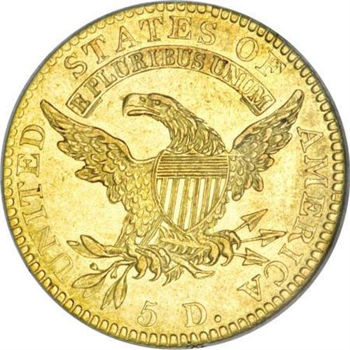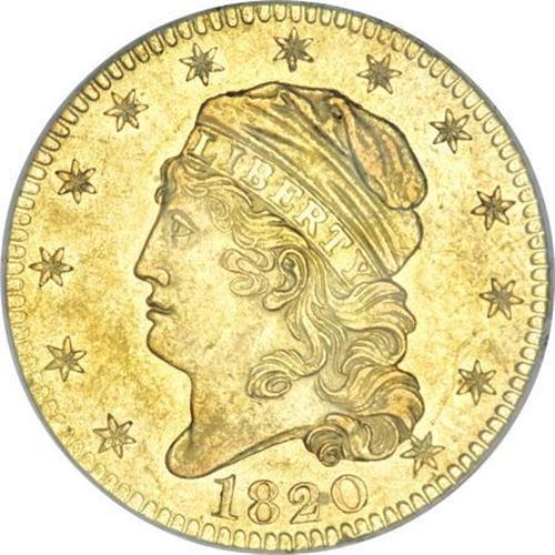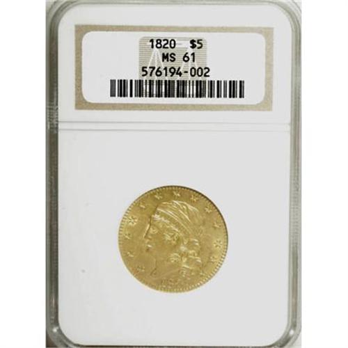 <B>1820 $5 Square 2 MS61 NGC.</B></I> Breen-6476, BD-2, High R.5 or possibly Low R.6. Square base 2, star 13 joins curl, large letters. When attributing varieties of early coins, specialists attempt to find easily visible diagnostic features, ideally unique to a given die pair, but otherwise shared by only a few. For example, John Dannreuther notes "Another feature of this variety is the weak 'rear talon of right foot usually seen hanging below top leaves pair ...' This distinctive feature can be used to immediately identify this variety. The last star touching the curl is also distinctive." His quote is from the Harry W. Bass, Jr. notebook. <BR> Dannreuther, Bass, Robert Miller, and Walter Breen all overlooked the single most unusual and distinctive feature of this reverse die. The top horizontal crossbar extends right through the shield border, and continues half way across the wing. The extension of the crossbar is every bit as heavy as the actual crossbar inside the shield. This feature can easily be seen without a glass.<BR> A sharp impression, with frosty lemon-yellow luster and few marks on either side, with a minor scratch inside stars 12 and 13.<BR><I>From The Casa Becca del Norté Collection.</B></I><BR><BR><B>Coin Engraver:</B> John Reich<BR><BR><b>Shipping:</b> Coins & Currency (<a target="_blank" href="http://www.heritageauctions.com/common/shipping.php">view shipping information</a>)