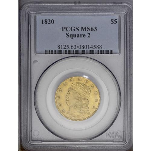 <B>1820<$5> Square 2 MS63 PCGS.</B></I> Breen-6476, B. 1-A, Miller-130, R.6. Although we have assigned a R.6 rating to this variety, several Mint State examples are known, and it may actually prove to be Rarity-5. Among all half eagles coined from 1808 to 1833, and 1834 With Motto coinage, the 1820 date has more varieties than any other. These fit nicely into three major categories: Curl Base 2; Square Base 2 with Small Letters; and Square Base 2 with Large Letters. This example fits into the last of these three groups.<BR> The design elements on both sides are rather sharply defined and the impression is nicely centered with complete border details on both sides. The surfaces have frosty yellow-gold luster with hints of orange color. A few wispy hairlines and other minor blemishes can be seen on both sides. A lovely example that will appeal to type, date, and variety collectors alike. <BR><BR><B>Important notice:</B> Heritage usually auctions material at the rate of 200-250 lots per hour. On some occasions eBay Live bid software or the Internet may not be able to keep up with the pace of the auction. We recommend placing a realistic absentee bid now as insurance to avoid disappointment. Occasionally the auctioneer may eliminate or reject an eBay Live bid, and the auctioneer may also reopen a lot after the close of the eBay live bidding (usually because we missed an audience bid), and may reject your bid even if it shows you as the winning bidder. By bidding via eBay Live, you agree that Heritage may award the lot to another bidder at its sole discretion under the circumstances described above or any other reasonable circumstances. Since eBay bids are not shown to us until we open the lot on the floor, we treat those bids just like floor bids. In most cases the floor responds before the eBay bid is presented to us, due to Internet lag time, so for consistency we have made it a policy that floor bids are always considered first over tie eBay live bids. Also please note that all Heritage lots purchased through eBay Live carry a 20% Buyer's Premium. Please make sure you read the Terms and Conditions before you bid. This lot is being auctioned in conjunction with a live floor auction by Heritage Galleries & Auctioneers. All final auction and invoice information will be supplied by Heritage Galleries & Auctioneers, and all other information should be considered preliminary. Lot:2634 <BR><BR><B>Winning Notification and Billing:</B> After the FINAL session in this auction is complete, Heritage will send e-mail and snail mail invoices. This process normally takes several days. All final auction and invoice information will be supplied by Heritage Galleries & Auctioneers, and all other information should be considered preliminary. <BR><BR>This auction will be conducted on a live auction floor and over the Internet through eBay Live. If you choose to place an absentee bid, please take a moment to <font color='#0000ff'><u><a href='http://pages.ebay.com/liveauctions/help/before/laabsentee.html'>learn how eBay Live absentee bidding works</a></u></font><font color='#000000'>