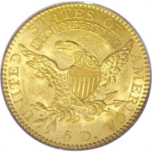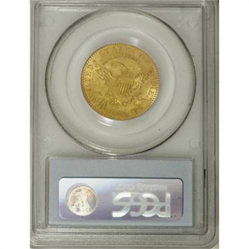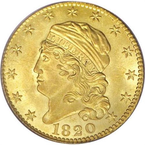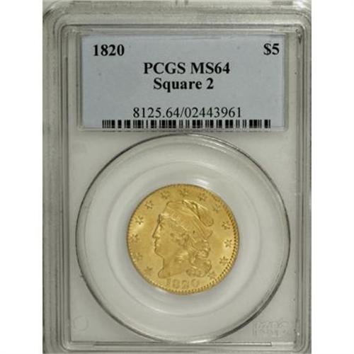 <B>1820 $5 Square 2 MS64 PCGS.</B></I> Breen-6476, BD-3, R.5. Three merged dentils between stars 8 and 9 identify this Square Base 2 obverse. Two different reverse dies were used with the obverse, and the BD-3 variety is distinguished by the position of I in PLURIBUS that is below the upright of the second T in STATES. The BD-4 variety has this I positioned below the extreme right base of the T.<BR> John Dannreuther's early gold reference has cleared up decades of confusion about the 1820 half eagle varieties. Known obverse and reverse dies were combined to form several nonexistent varieties in some earlier references, while others compiled variety descriptions from all of the earlier sources. One reference actually lists 13 different varieties for the date.<BR> Dannreuther records six obverse and six reverse dies that were combined to make nine different varieties. The BD-3 die combination is the only common one among all nine, yet less than 60 pieces are known in all grades. Using notes compiled by Harry Bass about his coins, Dannreuther also included limited die state information. Study of die states among the early gold varieties is still in its infancy. He listed two die states for BD-3. The early state is from perfect obverse and reverse dies that have no clash marks, die lapping, cracks, or rust marks. The late state, although still not cracked, has rust marks, clash marks, and lapping on both dies.<BR> An intermediate die state, unclashed and uncracked, this piece has rust marks on both sides and evidence of lapping only on the reverse. Frosty luster and sharp designs are boldly evident, accompanied by a few minor blemishes that include a hidden scratch in the shield. Highly appealing and desirable with brilliant yellow surfaces. Population: 11 in 64, 3 finer (7/07).<BR><BR><B>Coin Engraver:</B> John Reich<BR><BR><b>Shipping:</b> Coins & Currency (<a target="_blank" href="http://www.heritageauctions.com/common/shipping.php">view shipping information</a>\)