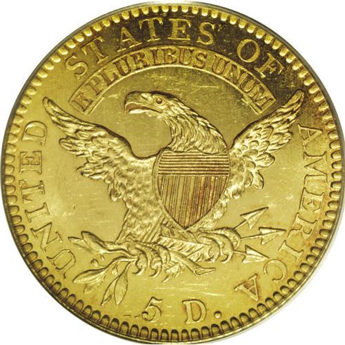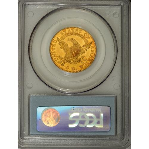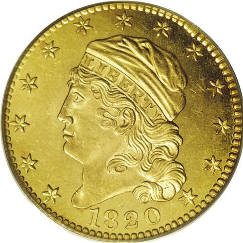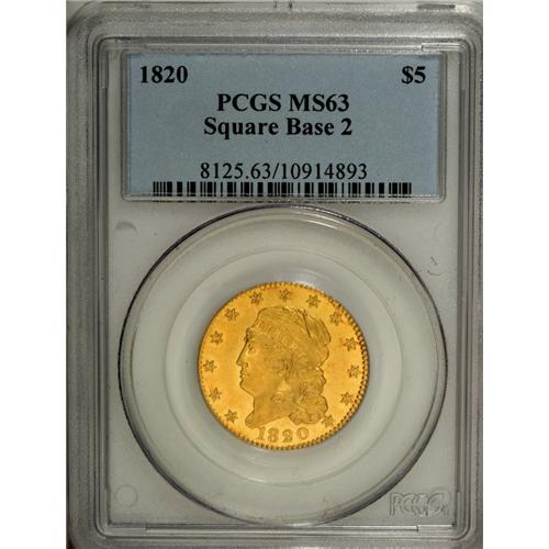 <B>1820 $5 Square Base 2 MS63 PCGS.</B></I> Large Letters. Breen-6476, BD-3, R.5. The Capped Head design half eagle was coined from 1813 to 1834, and the highest annual mintage occurred in 1820 with a total production of 263,806 coins. Not surprisingly, the largest number of individual die varieties have been identified from this year. In his new reference on the varieties of early gold coinage, John Dannreuther recorded nine different varieties representing three major types. All Square Base 2 coins have Large Letters on the reverse, while Curved Base 2 pieces have either Large Letters or Small Letters on the reverse.<BR> The reverse die of this example was not used with any other varieties, thus the tiny rust lumps left of the digit 5 are a diagnostic identifier. The BD-3 variety is the most readily available of the year, as pointed out by Dannreuther: "This is the only scarce variety of 1820 half eagle with a few more than 50 examples as the surviving population. The other eight varieties existing for this year are either rare, very rare, or exceedingly rare."<BR> This lovely Mint State piece has brilliant greenish-gold color with prooflike fields and a hint of cameo contrast. The surfaces have the usual light abrasions and tiny hairlines that are expected at the grade level. This piece is similar quality to the Bass-ANA example, and is one of the finest known of this die marriage.<BR><BR><b>Shipping:</b> Coin/Currency (<a target="_blank" href="http://www.heritageauctions.com/common/shipping.php">view shipping information</a>)