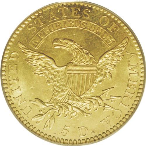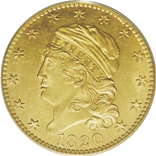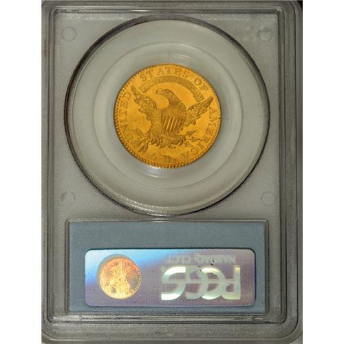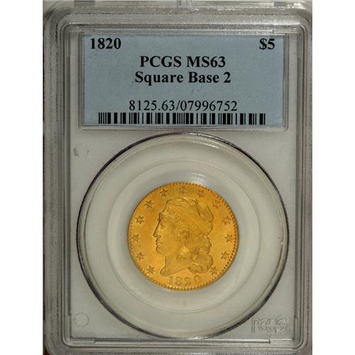 <B>1820 $5 Square Base 2 MS63 PCGS.</B></I> Large Letters. Breen-6476, BD-3, R.5. This is a stunning Mint State example with satiny honey-gold surfaces and nice cameo contrast. The surfaces are not prooflike, but they do display excellent reflectivity in the fields. This example is sharply struck with nearly full design details. Aside from the small die chips left of the digit 5, there is no evidence of any die imperfections such as clash marks or cracks. This is the only appearance of the reverse die, thus it is logical to assume that a later, terminal die state exists, but so far none have been discovered. Population: 17 in 63, 14 finer (12/06).<BR><BR><b>Shipping:</b> Coin/Currency (<a target="_blank" href="http://www.heritageauctions.com/common/shipping.php">view shipping information</a>)