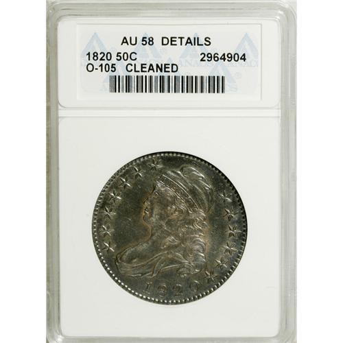 <B>1820 50C Curl Base 2, Small Date--Cleaned--ANACS. AU58 Details.</B></I> O-105. NGC Census: (51/34). PCGS Population (19/19). Mintage: 751,122. Numismedia Wsl. Price for NGC/PCGS coin in AU58: $800. (#6121)<BR><BR><b>Shipping:</b> Coins & Currency (<a target="_blank" href="http://www.heritageauctions.com/common/shipping.php">view shipping information</a>)