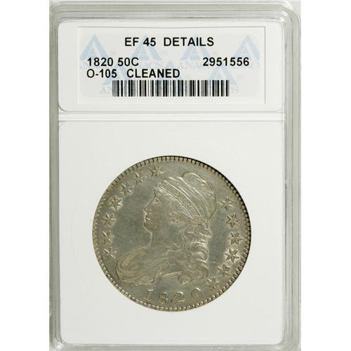 <B>1820 50C Curl Base 2, Large Date, Knob--Cleaned--ANACS. XF45 Details.</B></I> O-105, R.1. PCGS Population (11/39). Mintage: 751,122. Numismedia Wsl. Price: $318. (#6122)<BR><BR><b>Shipping:</b> Coins & Currency (<a target="_blank" href="http://www.heritageauctions.com/common/shipping.php">view shipping information</a>)