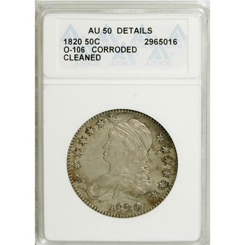 <B>1820 50C Curl Base 2, Small Date--Cleaned, Corroded--ANACS. AU50 Details.</B></I> O-106. NGC Census: (16/140). PCGS Population (20/73). Mintage: 751,122. Numismedia Wsl. Price for NGC/PCGS coin in AU50: $458. (#6121)<BR><BR><b>Shipping:</b> Coins & Currency (<a target="_blank" href="http://www.heritageauctions.com/common/shipping.php">view shipping information</a>)