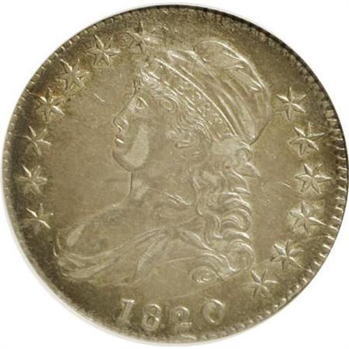 <B>1820 50C Curl Base 2, Small Date XF45 NGC.</B></I> O-103a. NGC Census: (36/532). PCGS Population (17/96). Mintage: 751,122. Numismedia Wsl. Price for NGC/PCGS coin in XF45: $318. (#6121)<BR><BR><B>Coin Engraver:</B> John Reich<BR><BR><b>Shipping:</b> Coins & Currency (<a target="_blank" href="http://www.heritageauctions.com/common/shipping.php">view shipping information</a>)