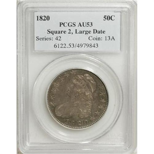 <B>1820 50C Square Base Knob 2, Large Date AU53 PCGS.</B></I> O-105. PCGS Population (3/29). NGC Census: (0/0). (#6122)<BR><BR><B>Coin Engraver:</B> John Reich<BR><BR><b>Shipping:</b> Coins & Currency (<a target="_blank" href="http://www.heritageauctions.com/common/shipping.php">view shipping information</a>)