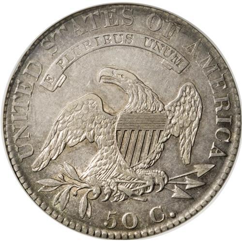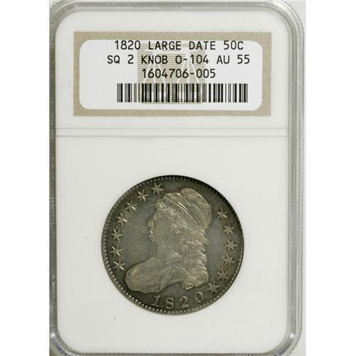 <B>1820 50C Square Base Knob 2, Large Date AU55 NGC.</B></I> O-104, R.4. The date is among the widest in the entire Capped Bust half series, with the knobbed, square-base 2. Star 2 is recut on it two inner-right points. On the reverse the D is much lower than the E in UNITED, and a die crack runs through the denomination, across the lowest arrowhead, and nearly to the rim. The lustrous surfaces are dove-gray with glints of gold and ice-blue near the rims.<BR><BR><b>Shipping:</b> Coins & Currency (<a target="_blank" href="http://www.heritageauctions.com/common/shipping.php">view shipping information</a>)