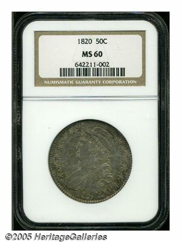 <B>1820<50C> Square Base Knob 2, Large Date MS60 NGC.</B></I> O-105, R.1. Draped in rich orange-gold and forest-green colors, this well struck piece has ample luster and some wispy blemishes concealed beneath the blanket of patination.