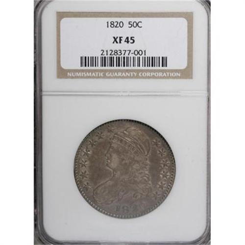 <B>1820 50C Square Base 2, Large Date XF45 NGC.</B></I> NGC Census: 0 in 45, 0 finer (2/08).PCGS Population: 12 in 45, 51 finer (2/08).(6122)<BR><BR><B>Coin Engraver:</B> John Reich<BR><BR><b>Shipping:</b> Coins & Currency (<a target="_blank" href="http://www.heritageauctions.com/common/shipping.php">view shipping information</a>)