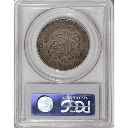 <B>1820 50C Square Base No Knob 2, Large Date MS62 PCGS.</B></I> O-108, R.2. As to be expected on this variety, the current coin is incredibly well struck on both sides. Amber toning throughout intermingles with electric-blue coloration at the peripheries. The 'pull away' toning effect observed near some devices attests to this coin's originality. Population: 2 in 62, 2 finer, for the subtype (12/07).<BR><BR><B>Coin Engraver:</B> John Reich<BR><BR><b>Shipping:</b> Coins & Currency (<a target="_blank" href="http://www.heritageauctions.com/common/shipping.php">view shipping information</a>)