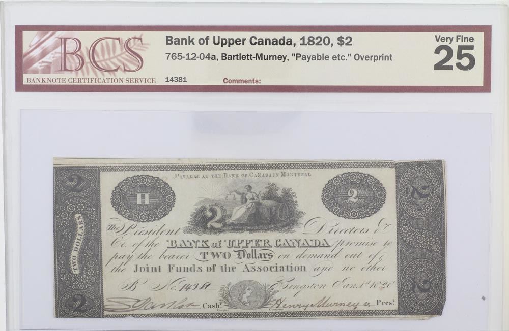 1820 Bank of Upper Canada $2. 765-12-04a, "Payable etc." Overprint, BCS VF-25