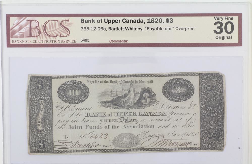 1820 Bank of Upper Canada $3. 765-12-06a, "Payable etc."Overprint, BCS VF-30, Original
