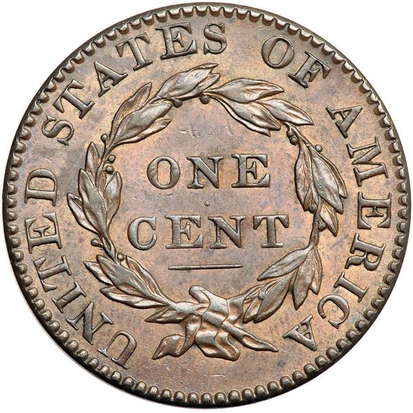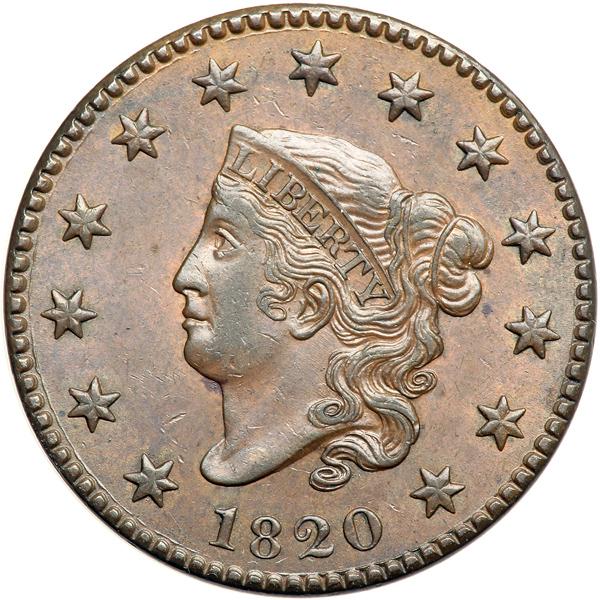 1820 Coronet Head Cent. PCGS graded MS-62 Brown. Glossy steel brown and chocolate with lots of frosty lighter steel brown toning faded down from mint color in the fields and protected areas. Excellent eye appeal with lots of underlying mint luster remaining on both sides. There is a small spot of reddish chocolate toning at the throat, and a speck of verdigris is located in the center of this spot. Otherwise just a few trivial contact marks, including a tiny diagonal nick midway between star 1 and the chin. Sharply struck EDS with smooth, hard fields on both sides and parts of an inner circle visible at the dentils around more than half of the obverse. Called MS60 net AU55 and tied for CC#4 in the Noyes census, his photo #31165. Bland says AU55 and tied for CC#3 among the confirmed examples in his census. Comes with a long, distinguished provenance. Our grade is AU55. Pop 1; 1 in 64 BN. Only 2 graded at PCGS for the variety. DWH #2588 (PCGS # 36691) .