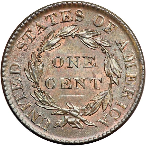 1820 Coronet Head Cent. PCGS graded MS-63 Brown. Choice lustrous light bluish steel brown and chocolate with underlying faded mint red showing through in the protected areas. There is a small stain of darker bluish olive toning in the hairbuns and another between the 2 & 0 in the date. Would rate a higher grade if not for a dull, light scrape in the field between stars 5 & 6, and this scrape left a shiny area in the midst of lustrous flowlines. Excellent eye appeal in spite of this minor defect. M-LDS with a clear die crack joining the bust to star 1. Called MS60 net AU55 and CC#2 in the Noyes census, his photo #32880. Removed from an NGC slab graded MS64BN (NGC label included). Our grade is MS60 Plus. Pop 1; None finer at PCGS for the variety. PCGS has graded only 2 examples, this one and an AU55. DWH #2590 (PCGS # 36697) .