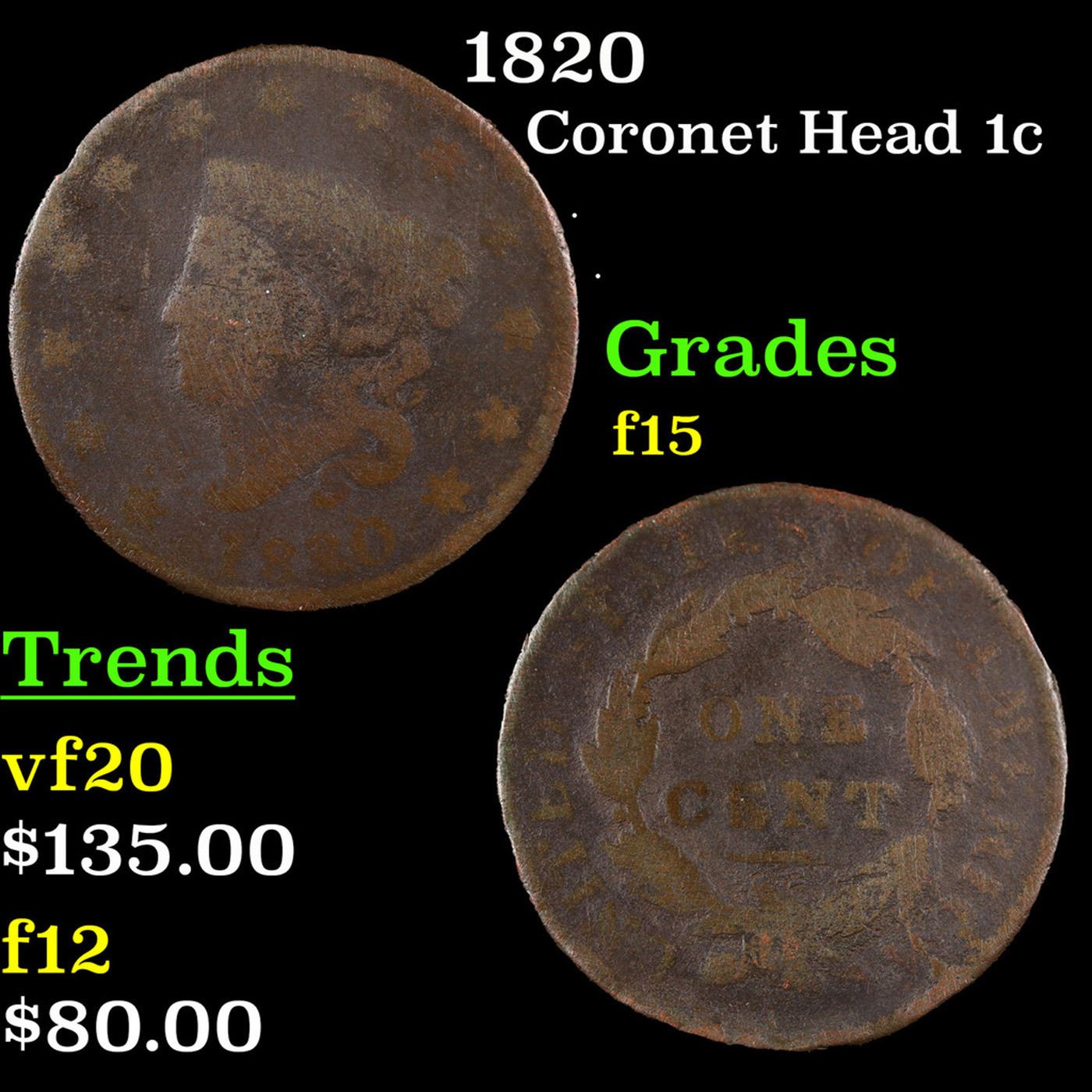 1820 Coronet Head Large Cent 1c Grades f+.