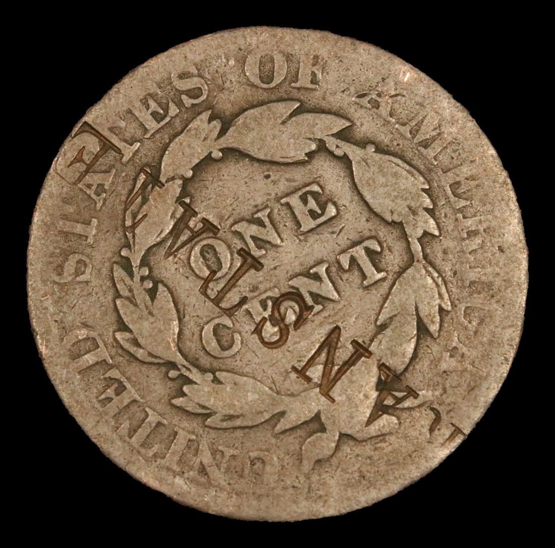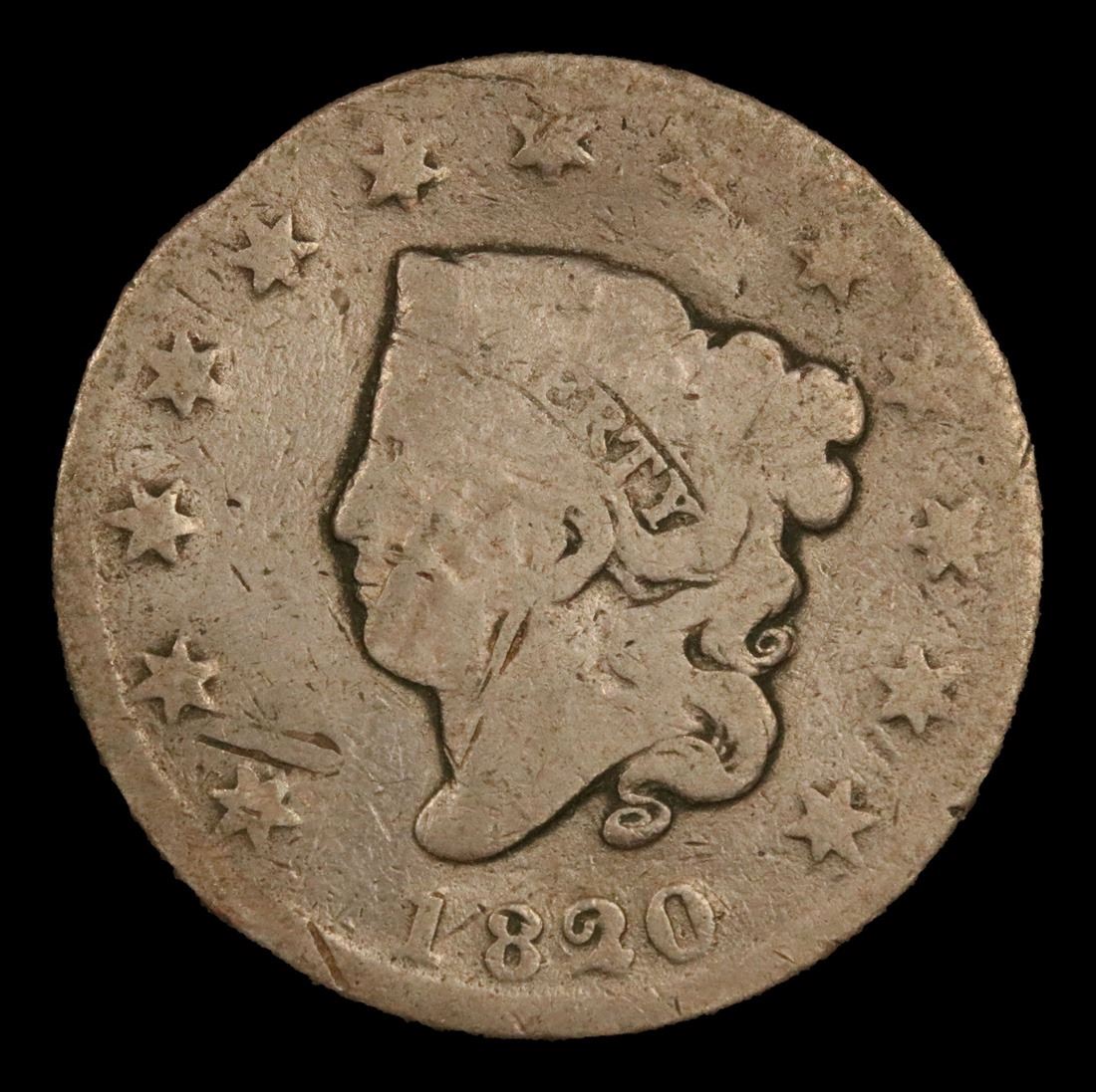 1820 Small Date, Counter Stamp 'KAN STATE' . Coronet Head Large Cent 1c Grades vg details.