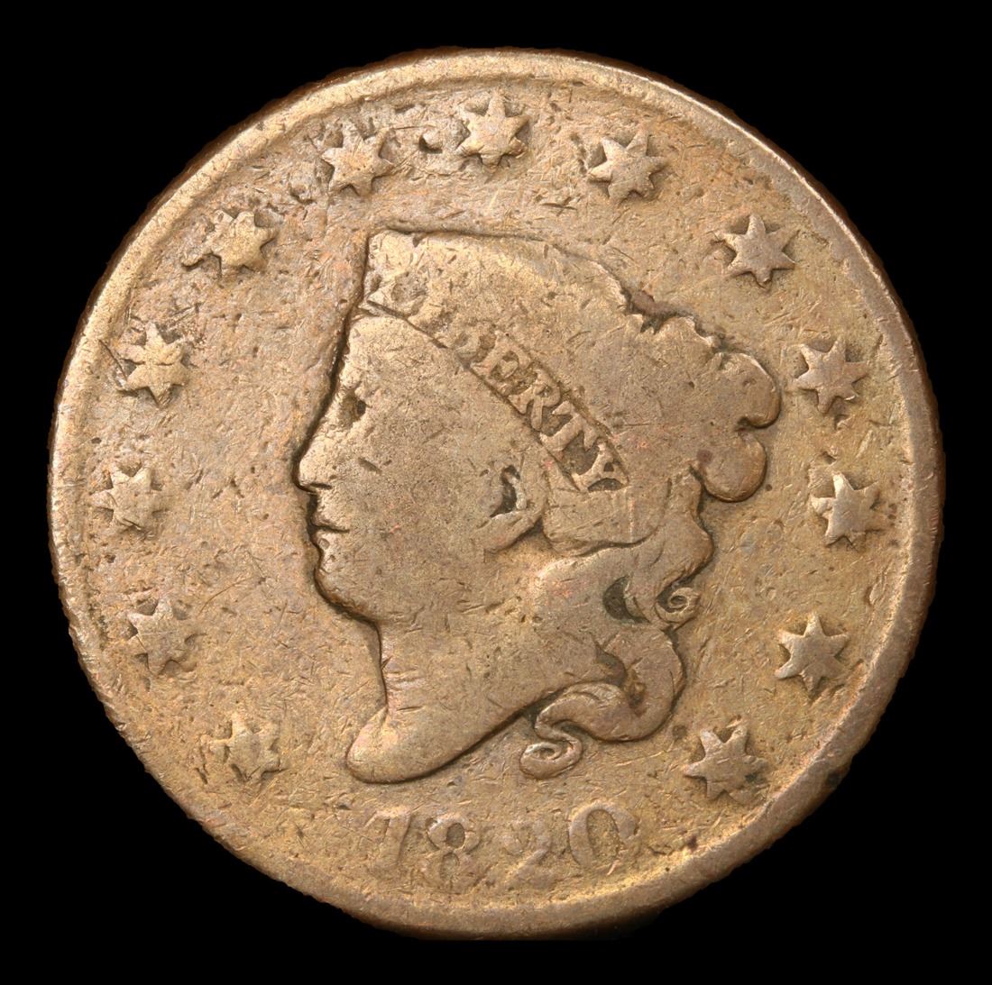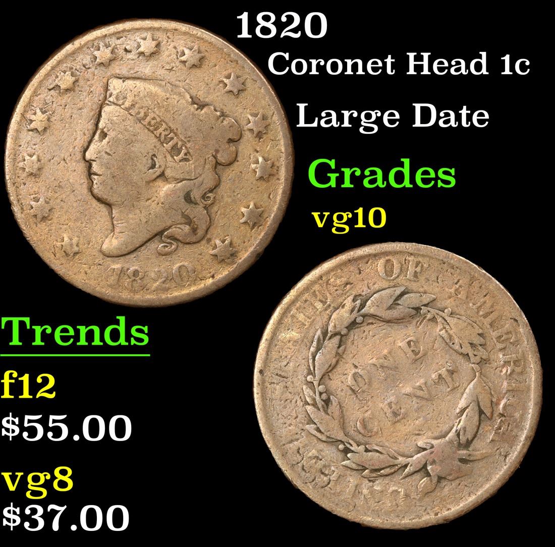 1820 Large Date . Coronet Head Large Cent 1c Grades vg+.