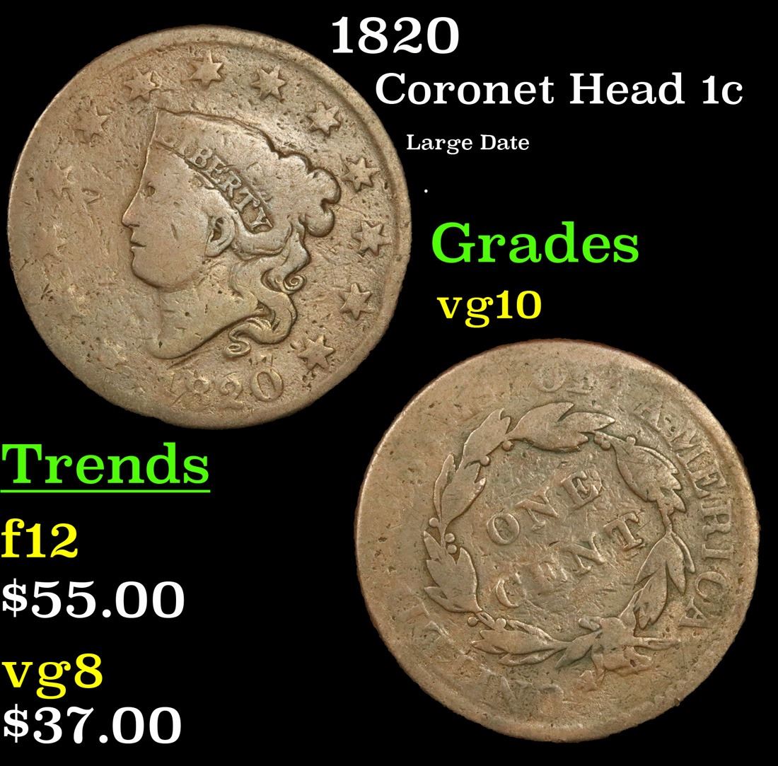 1820 Large Date . Coronet Head Large Cent 1c Grades vg+.