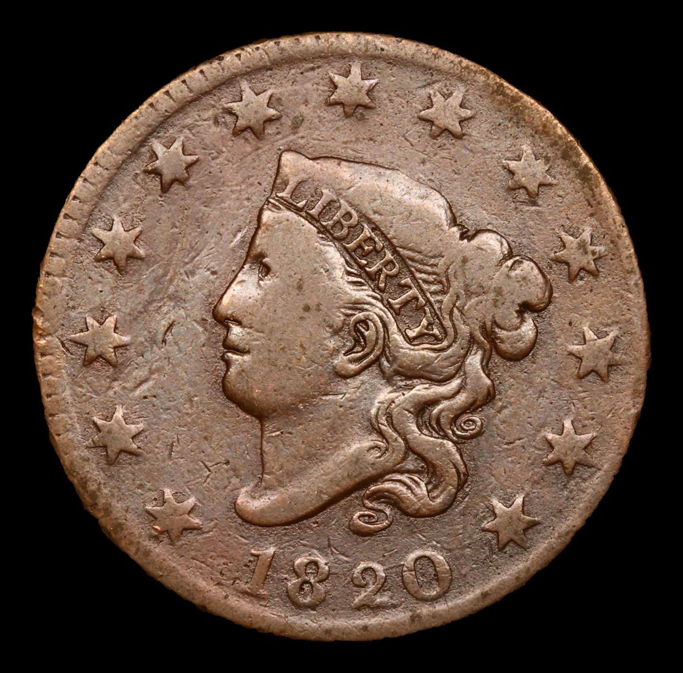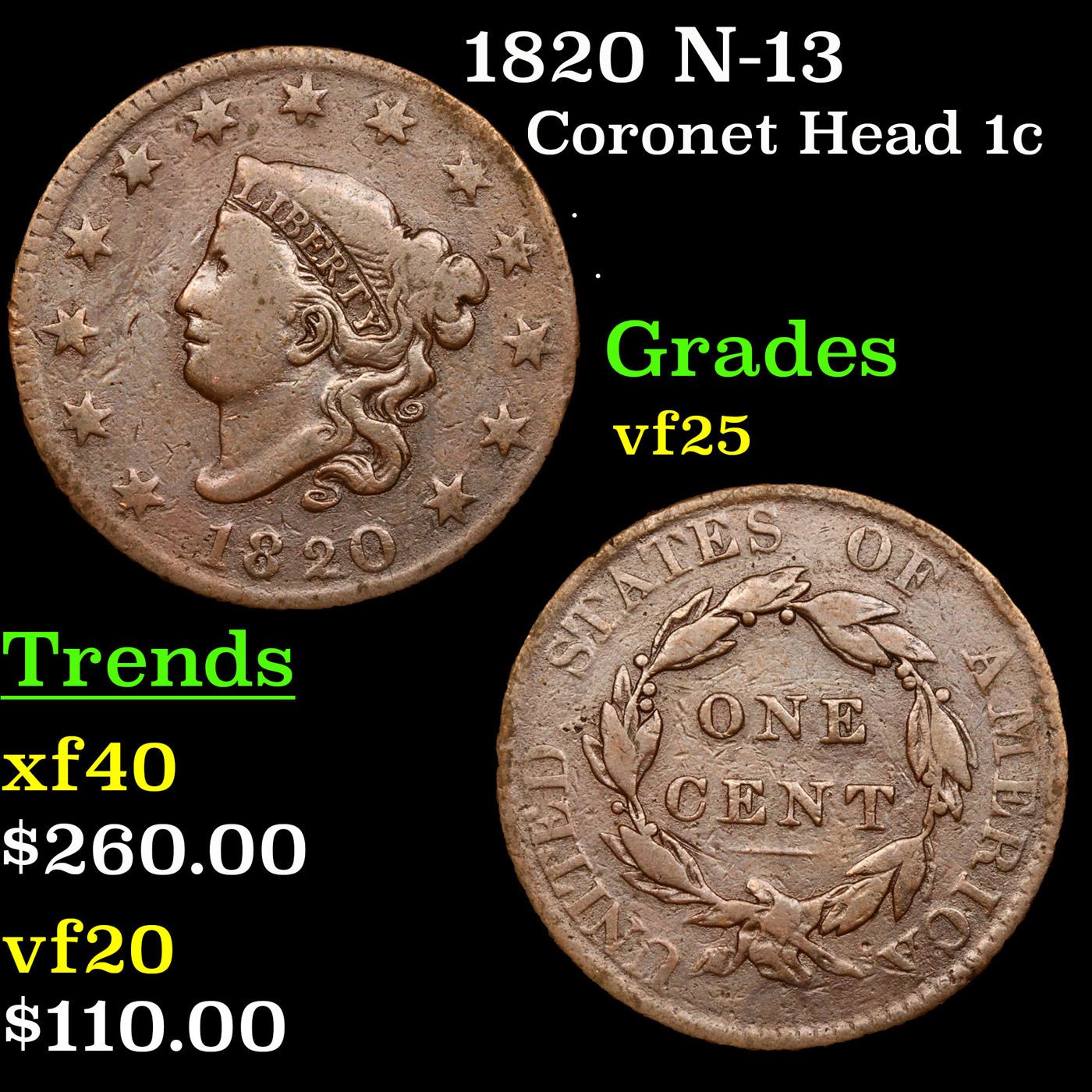 1820 N-13 Coronet Head Large Cent 1c Grades vf+.