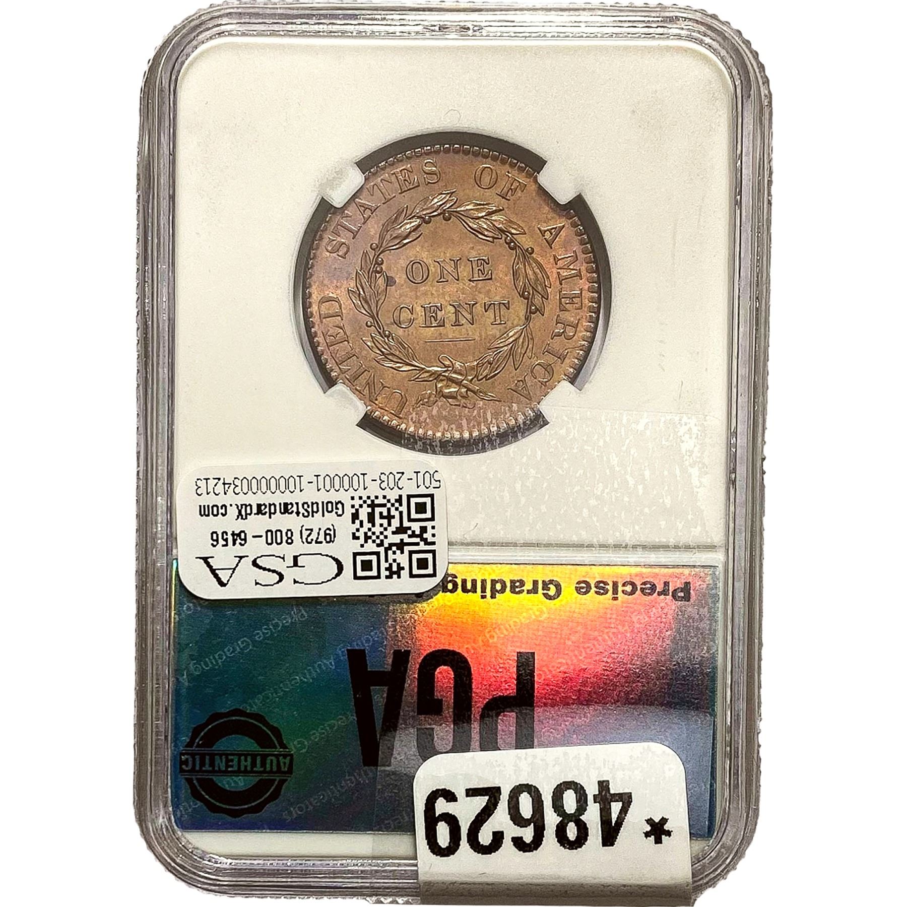 l. All non-certified coins and currency are guaranteed genuine, but are not guaranteed as to grade, since grading is a matter of opinion, an art and not a science, and therefore the description rendered by GSA or any third-party grading service may not agree with the opinion of others (including trained experts), and the same expert may not grade the same item with the same grade at two different times. GSA may, but is not obligated to, express an opinion as to non-certified numismatic items, in GSA’s opinion, or by its employees’ experience and the current interpretation of the American Numismatic Association’s standards as of the date the catalog was prepared. There is no guarantee or warranty expressed or implied that the grading opinions utilized by GSA, if any, will meet the standards of any grading service at any time in the future.