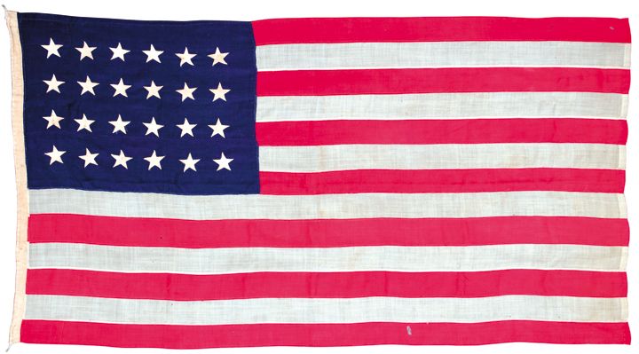 Circa 1820, this 24-Star American Flag represents the State of Missouri's entrance into the Union. This original Hand-Sewn American Flag is made of Muslin Linen, measures 46” x 83” with 24 Hand-Sewn, Double-Appliqued Cotton Stars. The Stars are configured in the rare 6/6/6/6 Pattern, in horizontal rows, within the muslin canton. The fly is constructed of 13 Hand-Sewn muslin stripes. There are a few small, scattered holes throughout the stripes or “fly” with a somewhat larger hole along lower right edge of bottom stripe, plus a few marks on hoist that look to be minor rope burn marks. The muslin hoist is marked what appears to read “G. King” along the top edge, with a few other inked letters on hoist that are illegible. This is an excellent size, extremely rare original, historic 24-Star American Flag with a great “6/6/6/6” Pattern Design. The first we have offered as such.