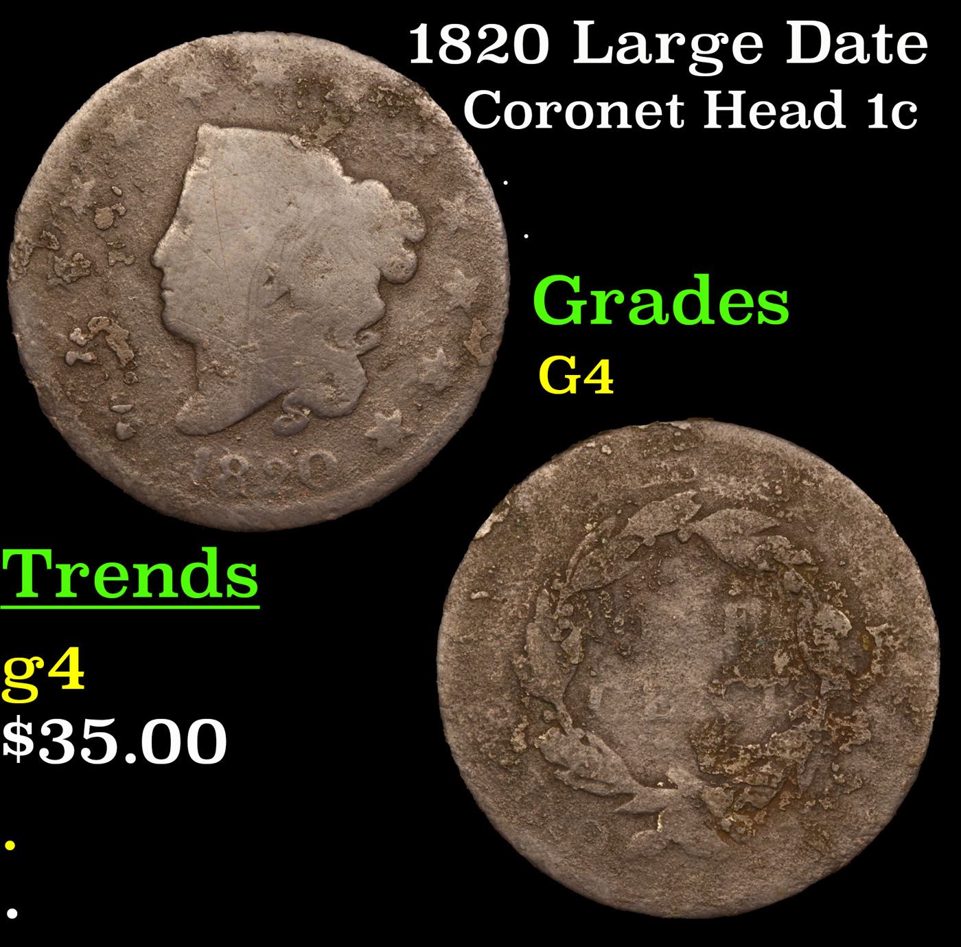 1820 Large Date Coronet Head Large Cent 1c Grades g, good