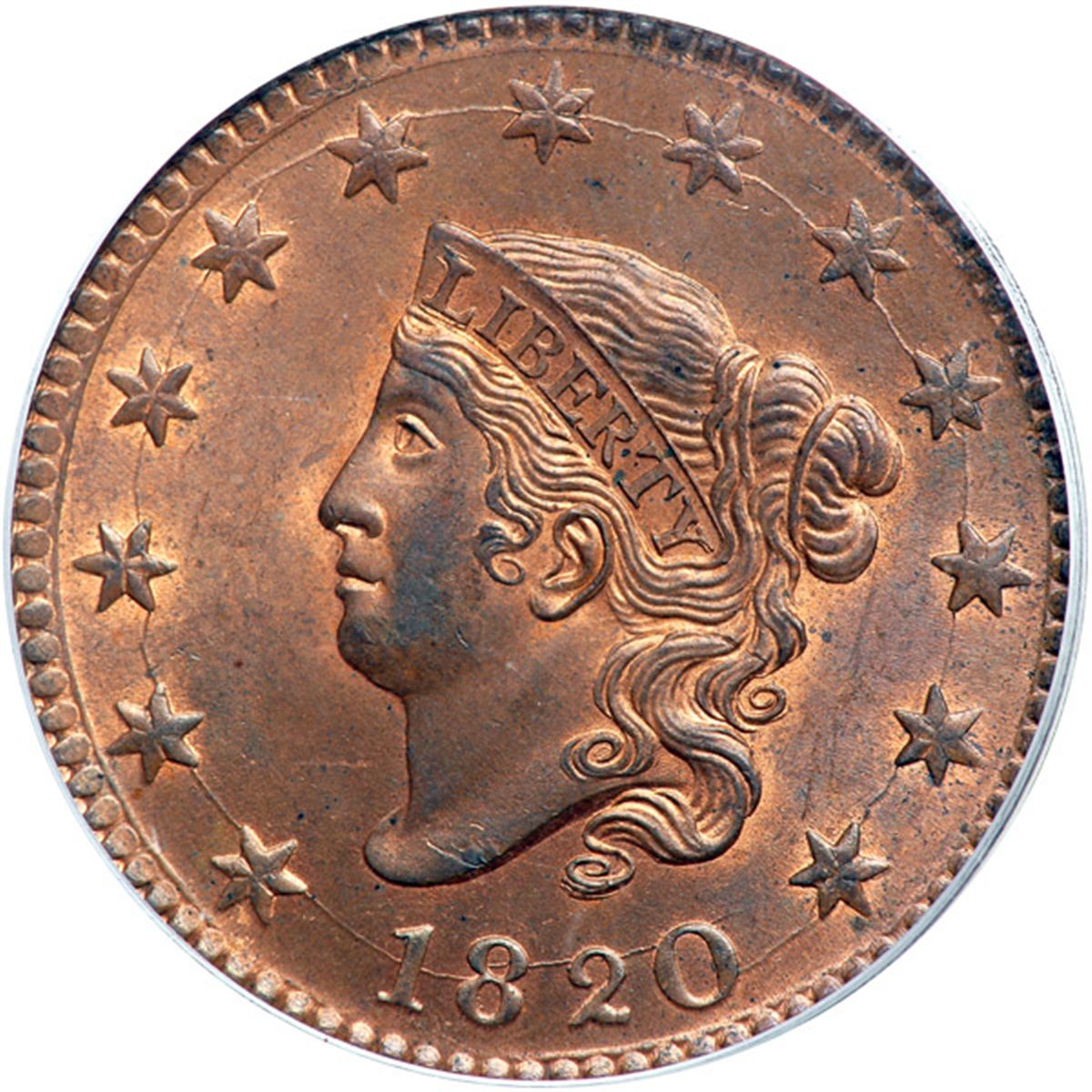 1820 N-13 R1 Large Date PCGS graded MS64 Red & Brown. Attractive lustrous steel brown fading to olive brown on the highpoints. At least 20% of the mint red remains, mostly on the obverse. The obverse is essentially flawless while the reverse shows a couple minor marks, including traces of an old fingerprint on the left side and a spot of shallow verdigris on the left foot of the F in OF. MDS, the usual die state associated with pieces from the famous Randall Hoard of mint state cents. A nice piece in spite of the minor flaws. Our grade is MS63. The attribution is noted on the PCGS label.