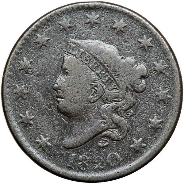 1820 N-14 R5- Large Date VG8. Slightly sharper but covered with fine roughness. No verdigris or notable marks. Rather glossy chocolate and olive brown. The date is clear and the attribution points are obvious.