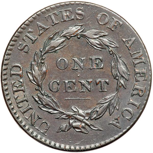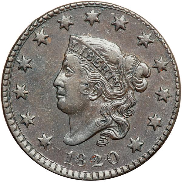 1820 N-15 R2 VF30+. Small Date. VF-30+. Glossy dark chocolate brown with frosty luster in protected areas. No notable marks, close to VF35. Sharply struck EDS, without any crumbling inside the N’s in ONE CENT. The inner circle on the obverse and the dentils on both sides are sharp. Struck slightly off center to K-3. A rare die state. DWH 0531.