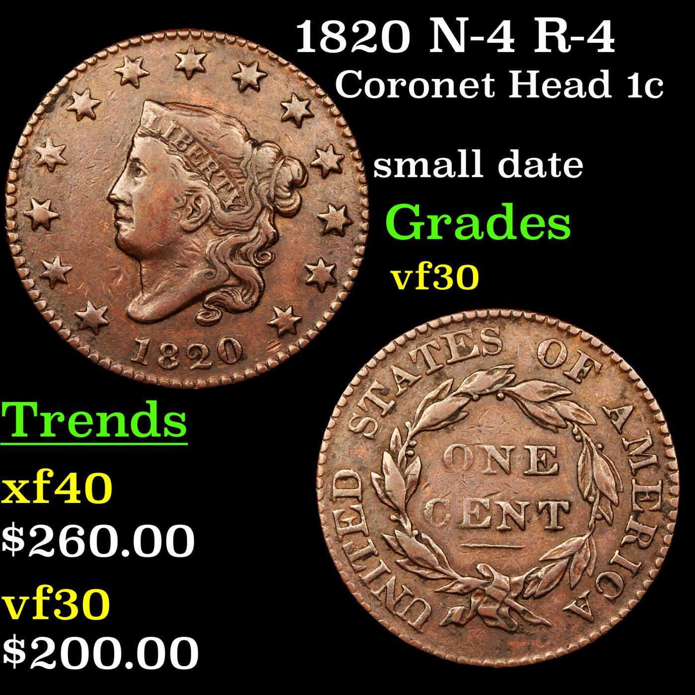 1820 N-4 R-4 Coronet Head Large Cent 1c Graded vf++.