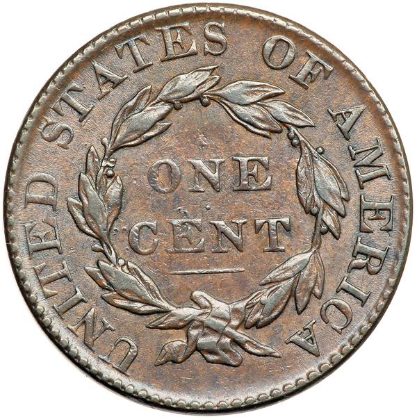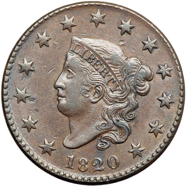 1820 N-5 R3 VF35. VF-35. Slightly sharper with a shallow dig just right of star 3 and another under star 8. Otherwise very nice for the grade, nearly choice, and the eye appeal is excellent. Frosty light steel brown with mint luster covering the protected areas. MDS. The fields are covered with fine radial die flowlines and most of the inner circle on the obverse is gone, only dull remnants of the circle remaining at stars 1-4. DWH #0507.